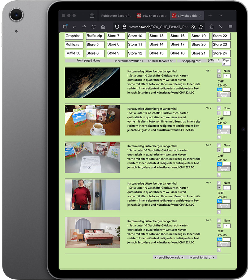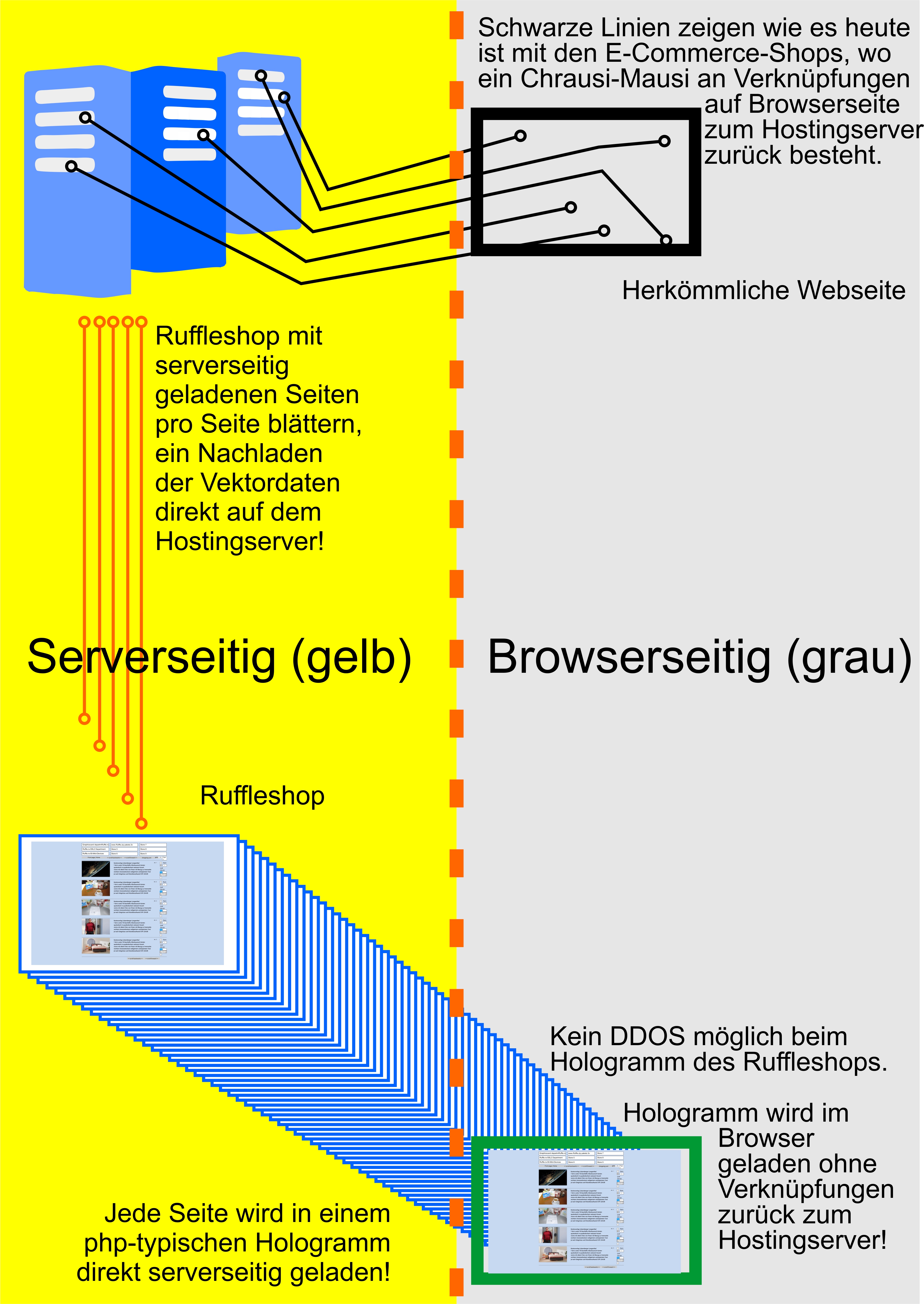 Nur der Warenkorb geht aber verschlüsselt zurück zum Hostingserver beim Ruffleshop, wo unser Kunde bestimmen kann, welche Autoresponder oder Bezahlfutures eingesetzt werden mit dem übermittelten Totalbetrag des Warenkorbes und der E-Mailadresse mitsamt Adresse des Shopbesuchers. Sonst besteht beim Ruffleshop-Hologramm bei jedem Blättern ein serverseitiges Nachladen einzelnder Seiten. Was den Shop zu herkömmlichen Seiten DDOS-sicherer macht und generell hacksicher. Der Ruffleshop ist der sichererste E-Commerce-Shop der Welt. Mit verschlüsseltem Server-PHP serverseitig ablaufendem Warenkorb.