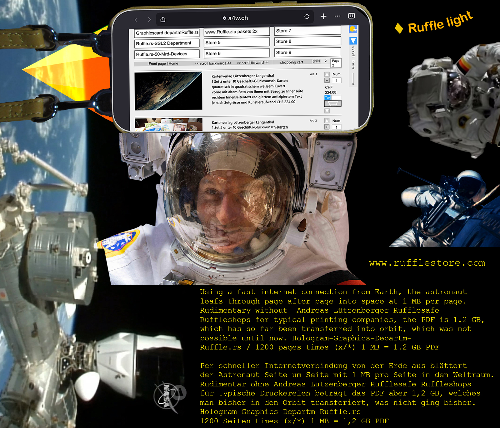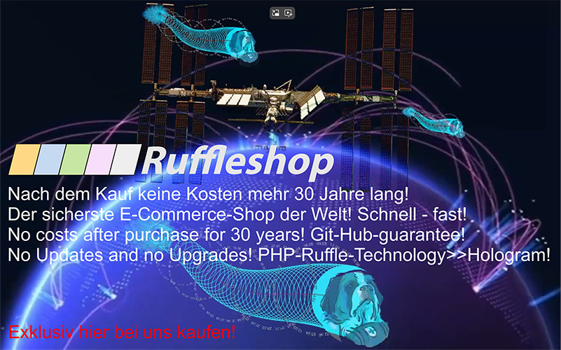 PHP und Ruffle laufen verschlüsselt ab auf der Seite der Hostingserver. Daher sieht der Endkunde beim Surfen im Browser kein Quelltext. Und daher ist es nicht hackbar. Bei beiden Programmiersprachen spricht man von Hologrammen. Ruffle hat den Vorteil, dass es nicht nur PHP-Daten projizieren kann, sondern auch (Vektor-)Grafiken. Beim Ruffleshop blättert der Kunde also auf dem Hostingserver Seite um Seite, die Einzelseiten werden bei jedem Katalogblättern auf dem Server blitzschnell geladen und durchs Hologramm hoch projiziert. Bei PHP und Ruffle sieht der Browserquelltext-Neugierige gar nichts, es sind versteckte Hologramm-Programmiersprachen. Da die Grafik in unserem Ruffleshop enthalten ist, ist der Ruffleshop der sicherste E-Commerce-Shop, da alles verschlüsselt via Hologramm geblättert wird, und vorallem der Warenkorb geht mitten durchs Hologramm verschlüsselt zurück. Kein DDOS ist möglich durch Hackerattacken. Kein PHP-Warenkorb kann angegriffen werden, da er verschlüsselt ist. Ruffleshop geht auch durch alle Firewalls hindurch durch den Ruffle-Container, der wie PHP verschlüsselt wirkt im Versteckten (Hologramm) und serverseitig abläuft im Versteckten. Unser Logo mit dem fliegenden Rufflebarry ist daher ein fliegendes Hologramm. Der Bernhardinerhund trägt ein mit dem roten Kreuz gekennzeichnetes Fässchen um den Hals.