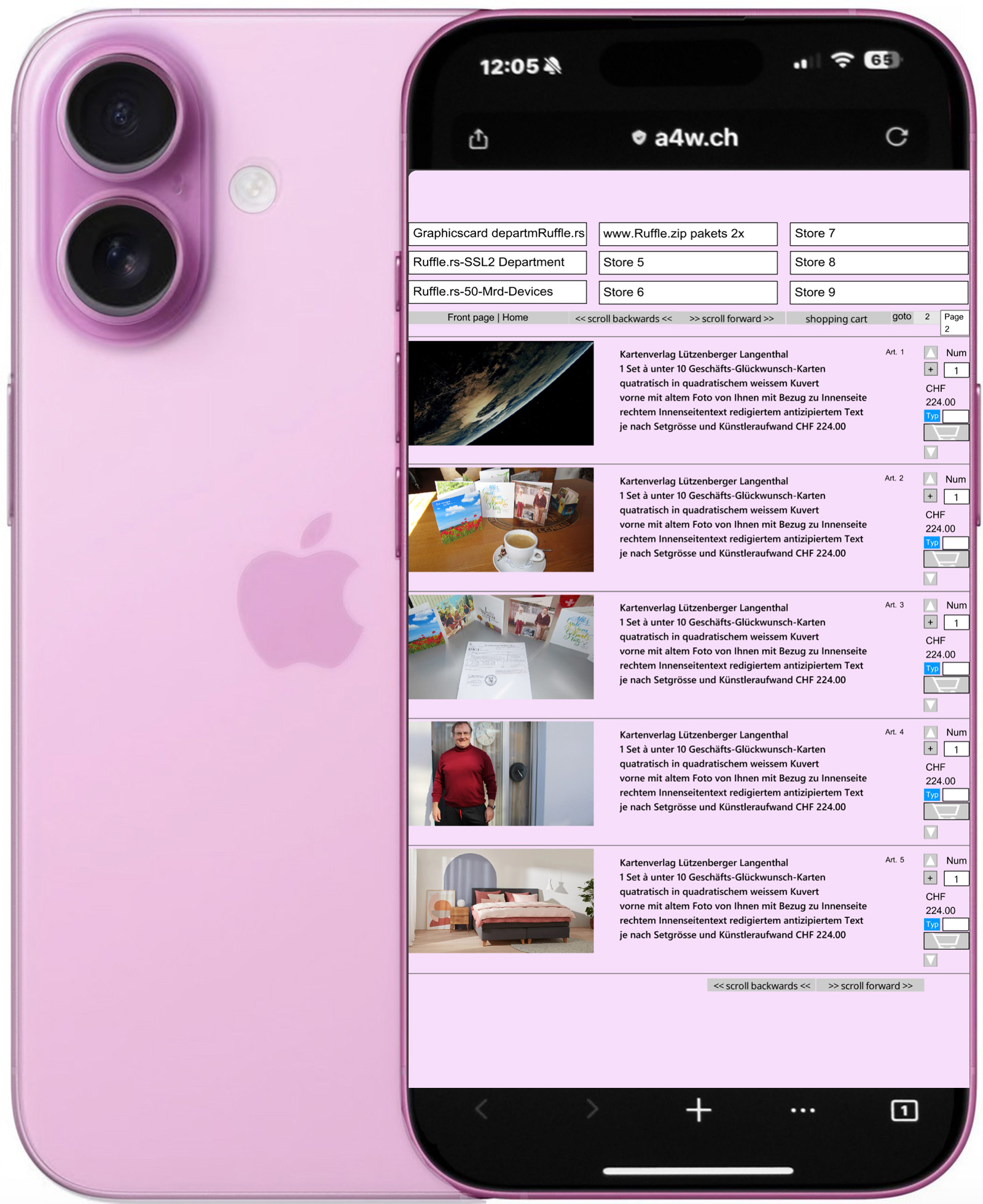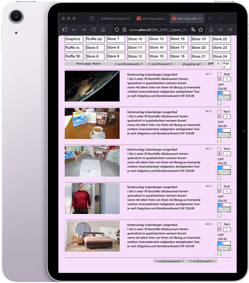 Ruffleshops haben 30 Jahre lang keine Betriebskosten nach dem Abkauf und sind überall abrufbar auf jedem Gerät der Welt und man kann jede Sprache der Welt ins Content eintippen. Besonders handlich sind diese auf den Desktop-Computern. Siehe Mustershops in den Verkaufsportalen in Dollar, Euro oder CHF und in allen Farben abrufbar. Der Ruffleshop öffnet sich auf allen Geräten der Welt im Hochformat auf alle Displays mit 100% Breite und 100% Höhe automatisch in Full-HD-Qualität. 87 Der Ruffleshop ist ein modernes Hologramm der heutigen Zeit