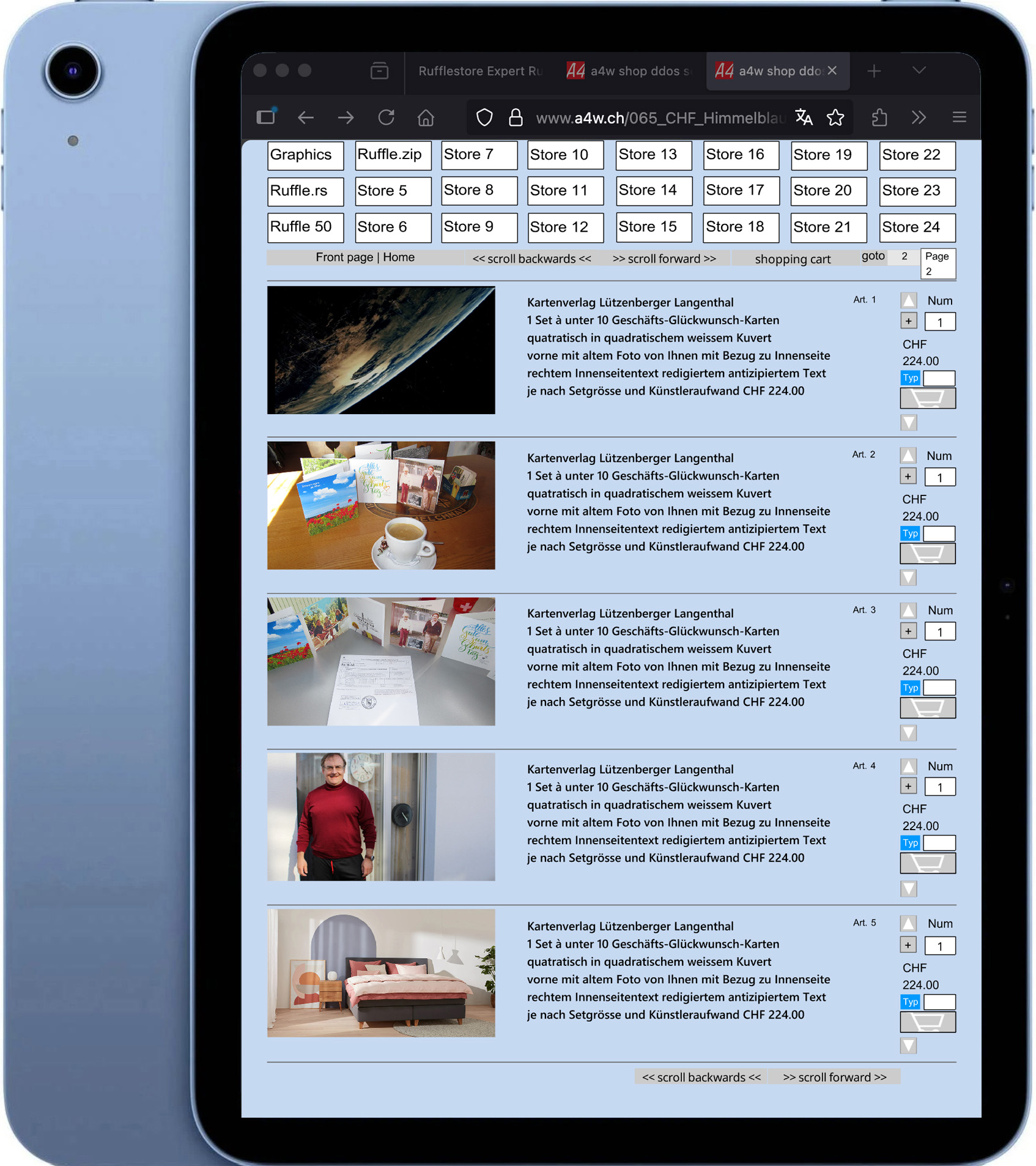 Ruffleshop Himmelblau and iPad Blau / Sparen Sie in den nächsten 30 Jahren genau 10800.- Euro Franken Betriebskosten (pro Monat 30.-). Beim Ruffleshop (Shopsoftware) gibt es keine (Betriebs-)Kosten! Die Firefox-Erweiterung ist dann bereits ab Gerätekauf standardmässig im Firefox voraus eingebettet, was den Ablauf verschönert im Firefox bezüglich Ruffleshop-Abrufs (ohne Pfeil, es lädt automatisch ohne Klicken auf den Standardpfeil). Wobei das Klicken auf den Pfeil im Safari ist auch schön!