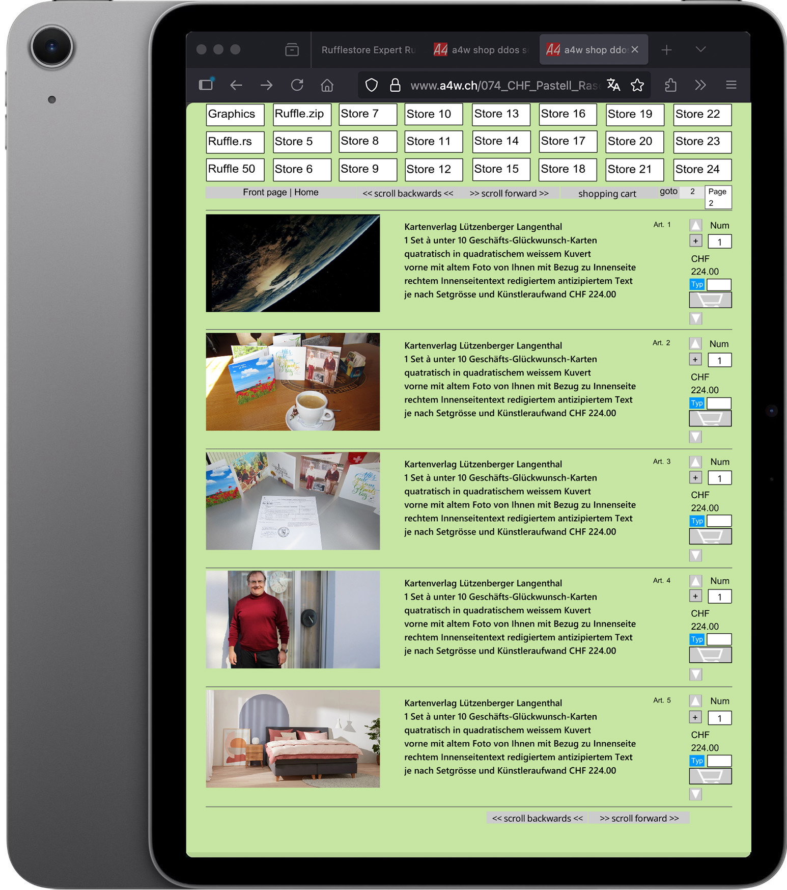 Ruffleshop Rasengrün and iPad Space Gray / Sparen Sie in den nächsten 30 Jahren genau 10800.- Euro Franken Betriebskosten (pro Monat 30.-). Beim Ruffleshop (Shopsoftware) gibt es keine (Betriebs-)Kosten! Die Firefox-Erweiterung ist dann bereits ab Gerätekauf standardmässig im Firefox voraus eingebettet, was den Ablauf verschönert im Firefox bezüglich Ruffleshop-Abrufs (ohne Pfeil, es lädt automatisch ohne Klicken auf den Standardpfeil). Wobei das Klicken auf den Pfeil im Safari ist auch schön!
